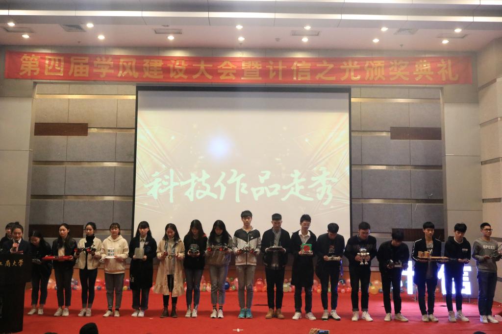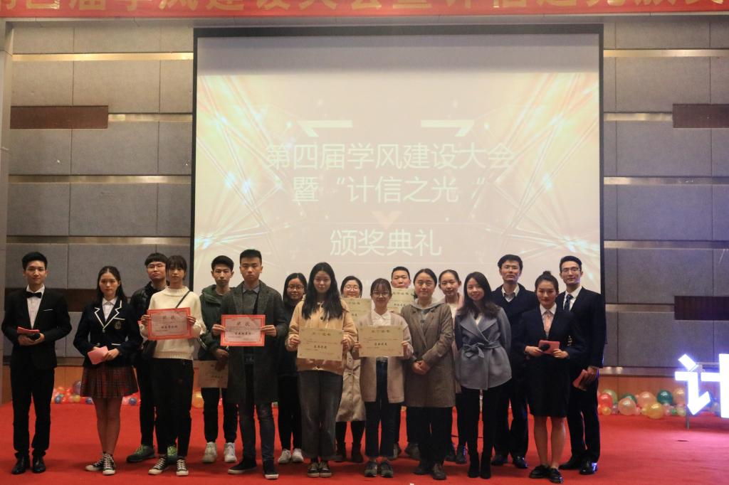 为推动和强化公司学风建设,提升员工的专业学习能力,激发科技的创新意识,弘扬甘于奉献的志愿精神,表彰2017-2018学年在学业、科创、志愿服务等方面先进,激励广大计信学子学习优秀、继续前行。计算机科学与信息工程公司在11月9日晚19:00,于伟德victor1946网站博智楼7100学术报告厅举办了本次学风建设大会暨“计信之光”颁奖典礼。计信公司分党委陈亚惠副书记、刘昶老师、邵磊老师、黄亚果老师、第三届“学业之光”获得者2015级物联网袁园以及2017级计信公司全体员工出席了此次活动。