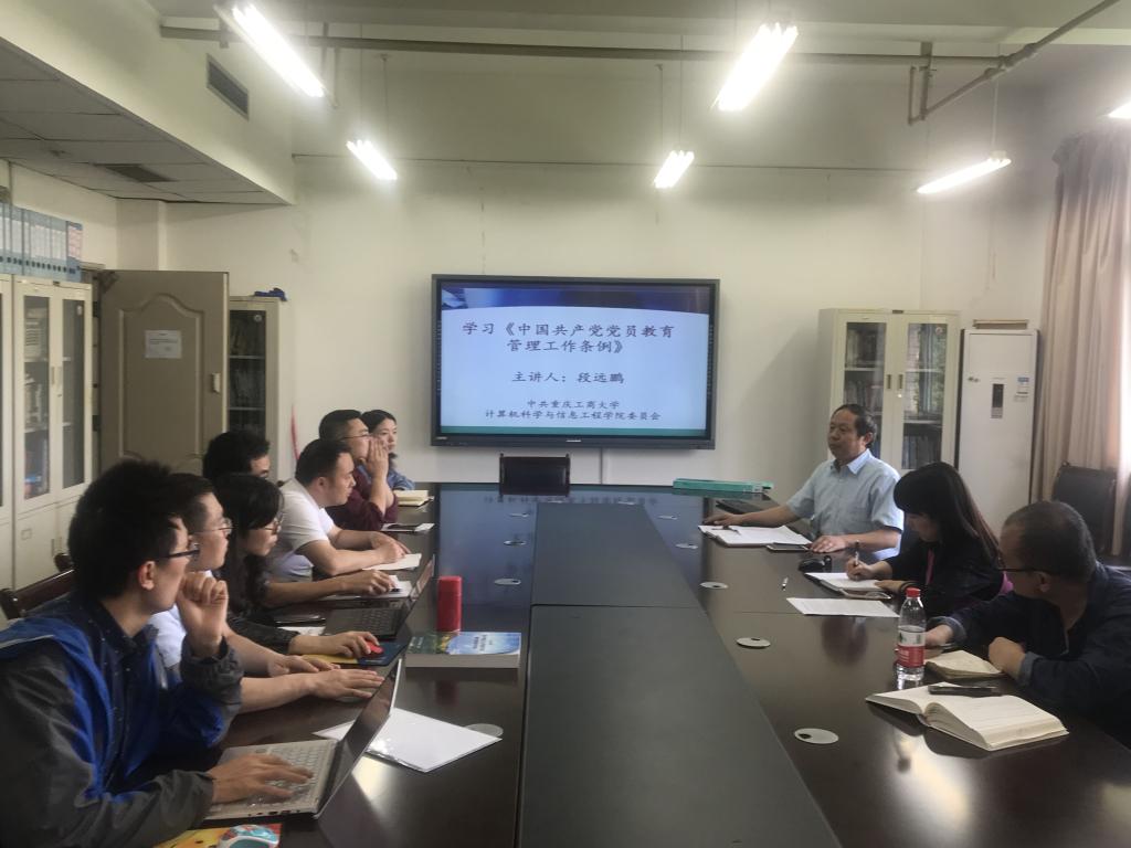 2019年5月22日下午,计算机科学与信息工程公司分党委组织党支部书记及系部主任在慧智楼90810会议室集中学习《中国共产党党员教育管理工作条例》。公司分党委书记段远鹏以“学习《中国共产党党员教育管理工作条例》”主题,为党支部书记及系部主任讲授党课。