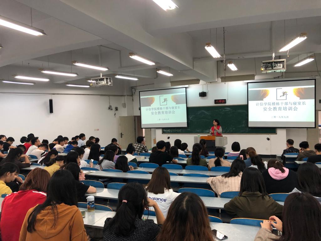 2019年9月18日中午12: 3 0,计信公司全体楼栋干部与寝室长安全教育专题培训会在慧智楼90326举行。本次培训会由公司公寓管理老师徐国平主持,公司陈亚惠副书记参加了本次培训会。培训会分两个议程,一是由徐国平老师对楼栋干部与寝室长进行安全教育与培训;二是陈书记进行总结发言,提出公寓安全管理应注意的事项。