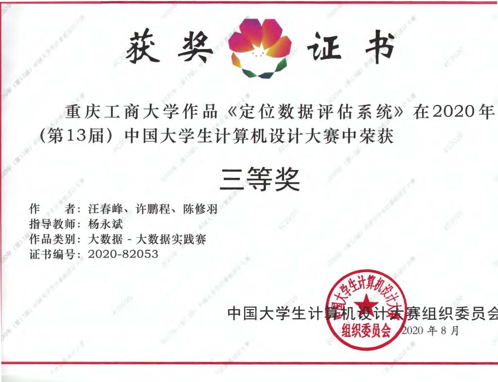 《定位数据评估系统》(作者:汪春峰、许鹏程、陈修羽 ,指导老师:杨永斌)获得全国三等奖
