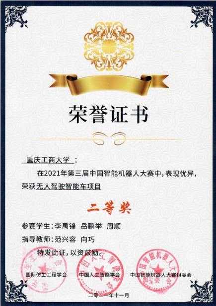 来自公司AI机器人科创团队的参赛作品《无人驾驶智能车项目》(作者:李禹锋、岳鹏举、周顺,指导老师:范兴容、向巧)获得全国二等奖。