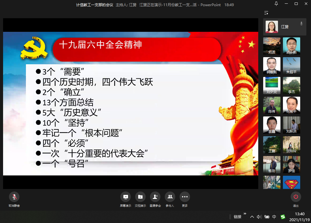 2021年11月19日、12月24日,伟德国际victor1946教工第一党支部分别在企业微信云端会议室、九教810会议室开展“学习全会精神,不忘初心使命”和“深度学习全会精神,助力教育事业发展”主题党日活动,认真学习了十九届六中全会精神。党的十九届六中全会对党的百年奋斗做了总结,主题鲜明、总结全面、重点突出,体现了马克思主义的人民立场、唯物史观和辩证方法,是我们党坚持唯物史观和正确党史观的一次重要体现。全会在百年未有之大变局和中华民族伟大复兴的重大历史关头举行,必将极大地统一全党思想、加强全党团结、推动党和人民的事业胜利前进。