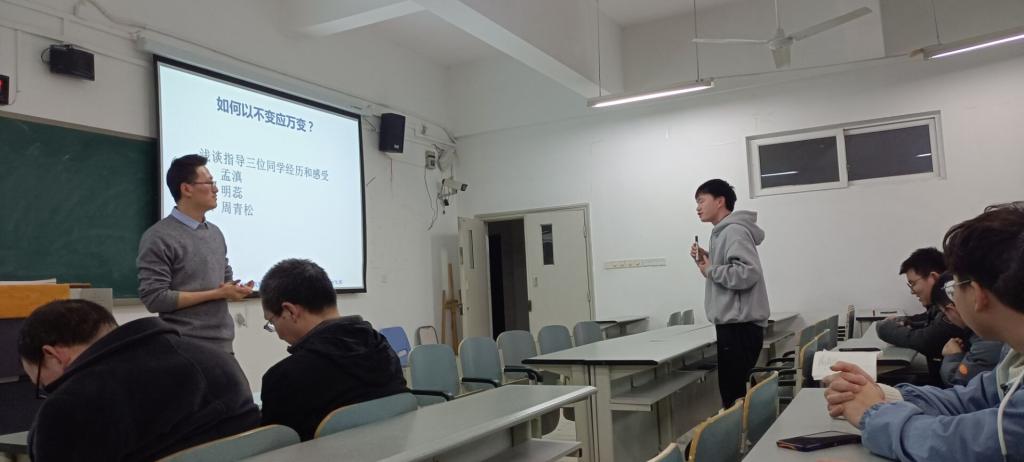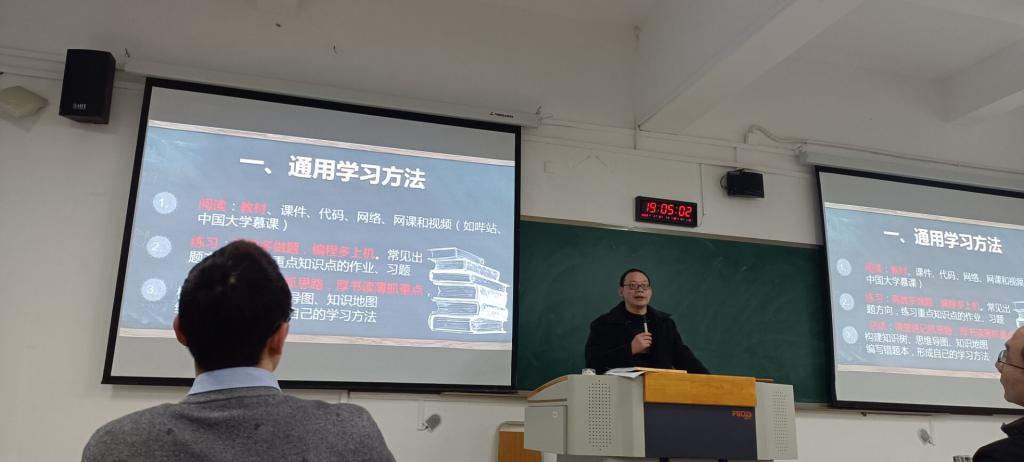 活动伊始,梁新元从通用学习方法、期末复习方法和专用学习方法三方面介绍了老员工如何高效学习的方法。梁教授重点强调了专用学习方法,并以线性代数多种题型求解的初等变换方法和“用变量变化表-读程序”、“迭代编程法-写程序”、“排除错误法-遇到错误”、“规范编码法-同行交流”的C语言学习方法为例进行了案例讲解。刘传文讲述了嵌入式工程师进阶指南,他从嵌入式课程体系和单片机入门两个方面进行深度讲解,使同学们了解成为一名嵌入式工程师需要学习和掌握知识和技能,同时也认识到要成为嵌入式工程师需要扎实学好专业课程,将动手和实践有机结合起来,勤学勤练。最后范兴容介绍了自动化专业就业与前景,他通过摆数据、讲事实,向同学们深入浅出的介绍了自动化专业就业去向和前景,并以三位优秀学长学姐的大学经历为案例,鼓励同学们早谋划、早规划、早成才。通过与同学们的互动讨论交流,同学们初步了解到自动化专业就业好、发展前景可观。
