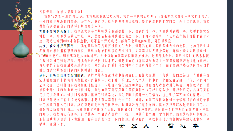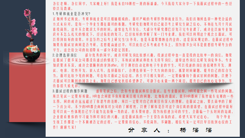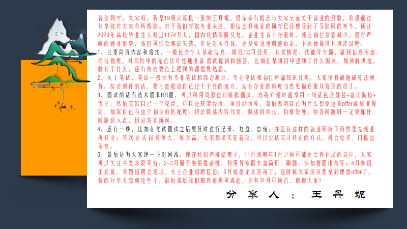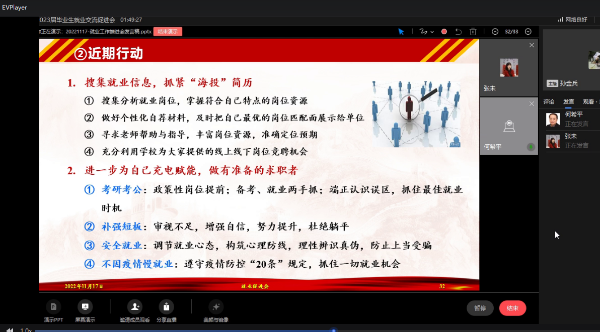 最后,张未提醒校外同学在实习和求职过程中要严格遵守当地疫情防控规定,做好防护,确保健康安全,随时保持理性,提高安全防范意识,识别求职陷阱。同时,对师生精彩的分享表示感谢,并送上了对2023届毕业生的美好祝福,期待同学们都能找到心仪的岗位,入职自己理想工作。