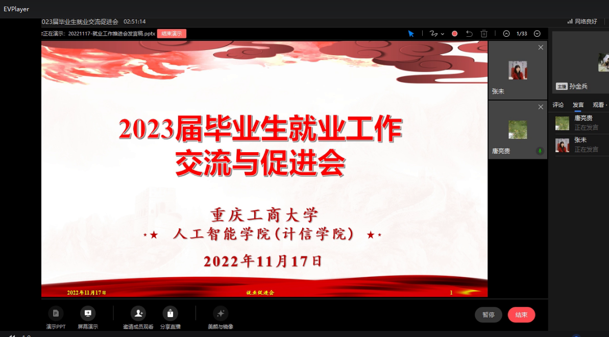 新冠肺炎疫情迁延反复使得我国高校毕业生就业形势更加严峻,对我国“稳就业”工作带来了巨大挑战。为贯彻“三全”促进毕业生就业创业的工作要求,2022年11月17日19时,伟德国际victor1946在线上举办了勇往“职”前——2023届毕业生就业工作交流与促进会。公司党委书记何希平、经理唐亮贵、党委副书记张未、副经理杨光详、副经理秦华锋、就业联络员孙金兵、各专业教师、毕业班辅导员和2023届全体毕业生参加了本次会议,与会师生对当下的就业前景和状态分别进行了交流发言。