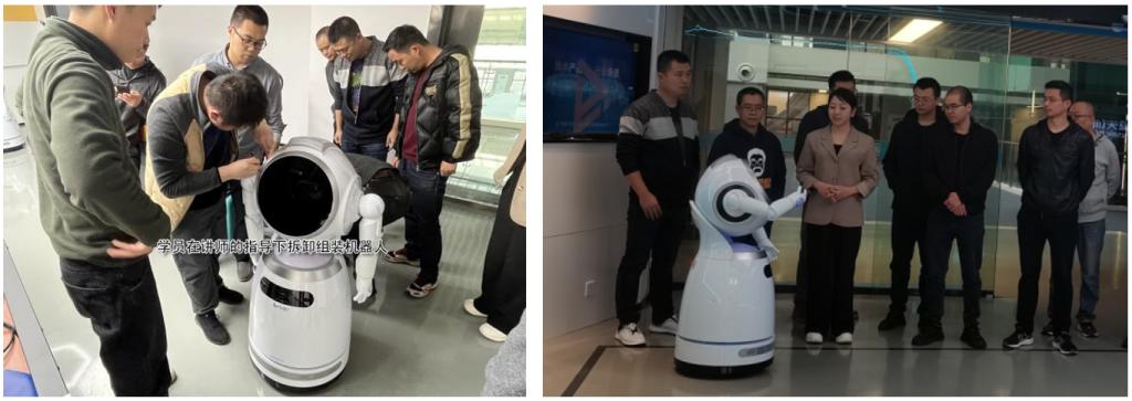 本次培训的中国(重庆)职业技能公共实训中心,是国家级公共实训基地,基地拥有先进的实训设备和设施,能够为学员提供优质的培训环境。团队培训为期5天,采用理论+实践+案例的培训学习模式,创新奇智(重庆)科技有限公司作为本次培训的技术合作方,为学员提供了丰富的实践和案例。对于大型服务机器人Cruzr,采用分组教学的形式,每位学员先通过公司开发的VR教学平台在线学习相关服务机器人的原理、结构、折装、调试等内容,然后通过设置一个实际应用场景(迎宾接待或展厅导览等),要求每位学员对机器人进行配置,发挥创造性,与机器人进行对话、互动,通过编程控制使智能机器人在不同的场景中完成不同的工作任务,以此来加深学员对服务机器人应用行业的了解。