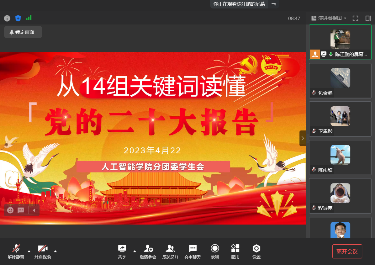 为深入学习宣传贯彻党的二十大精神,号召新时代青年紧跟党的步伐,深入贯彻落实习近平总书记关于青年工作的重要思想,进一步深化新时代高校员工会改革和建设,不断提升员工满意度、大局贡献度和社会认可度,4月22日中午1点,伟德国际victor1946分团委员工会以线上会议的形式举行了党的二十大精神学习分享会。院员工会主席团和部长团全体成员参与了本次会议,会议由主席团成员陈江鹏主持。