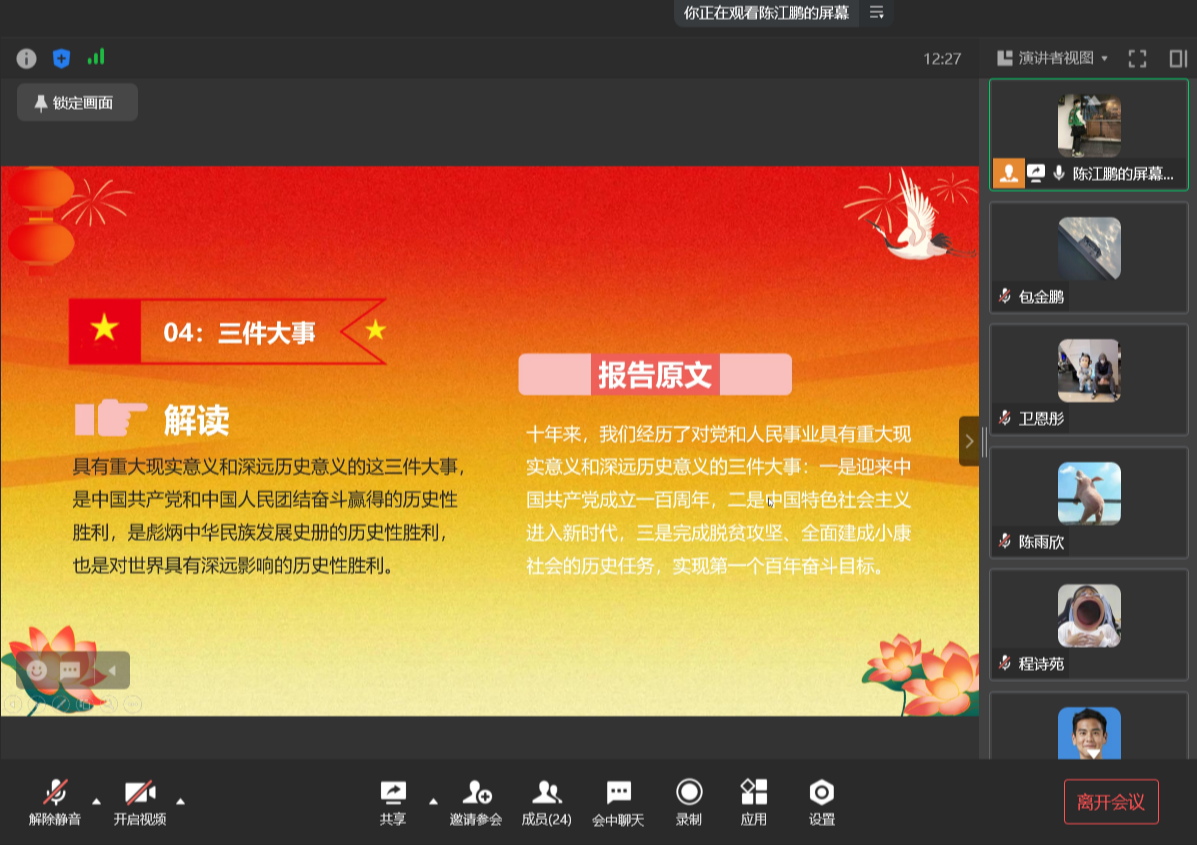 会议开始,陈江鹏以14组关键词同与会同学分享了党的二十大报告学习体会。通过回顾新时代十年的伟大变革和党的十九大以来极不寻常、极不平凡的五年以及十年来党和人民共同经历的三件大事,对党过去十年来的伟大工作进行了全面的了解。接着,陈江鹏对马克思主义中国化时代化新境界和中国式现代化的解读让大家认识到中国在新时代的洪流中不仅实现着中国自身的繁荣发展,也在全球经济中起着“稳定器”的重要作用,为人类社会的发展做出了重大贡献。