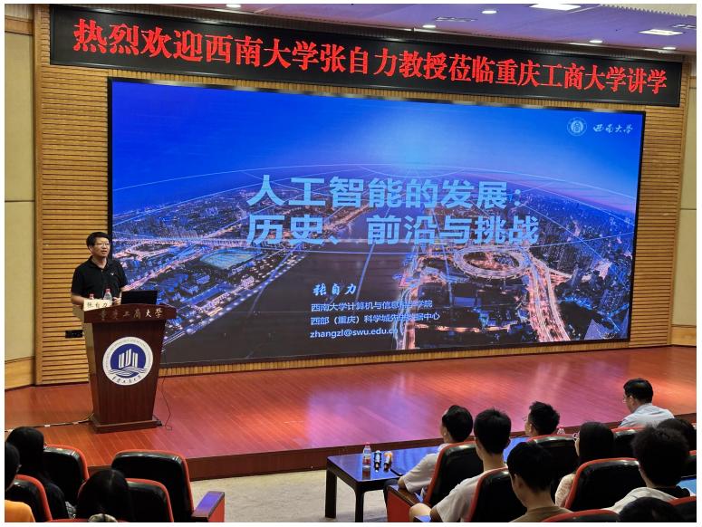 6月8日下午,西南大学计算机与信息科技公司的张自力教授莅临伟德victor1946网站,为师生带来了一场以“人工智能的发展:历史、前沿与挑战”为主题的精彩的学术报告。研工部副部长、研究生院副经理邓龙奎、伟德国际victor1946经理唐亮贵出席讲座,各研究生组织成员以及研究生代表到场参加。