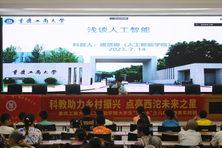 “人脸识别也称人像识别、面部识别,警方利用人脸识别技术多次抓到了在逃人员,那其原理是怎么回事呢,其实……。”社会实践团成员以小见大,从身边小事引入到人工智能发展历程,展示智能科技在生活中的作用与未来应用前景。宣讲内容生动有趣,激发了在场居民对人工智能的兴趣,参加活动的当地孩子们认真听讲,积极思考并踊跃参与问答互动。