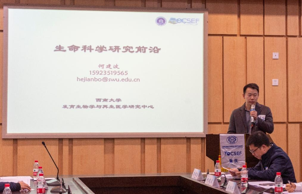 西南大学教授何建波作了题为《生物学前沿研究》的报告。他从发育生物学的关键问题出发,介绍了单细胞蛋白质组学技术、基因测序的特性和人体细胞百科全书的意义,加深了大家对生命科学本质的认识和理解。