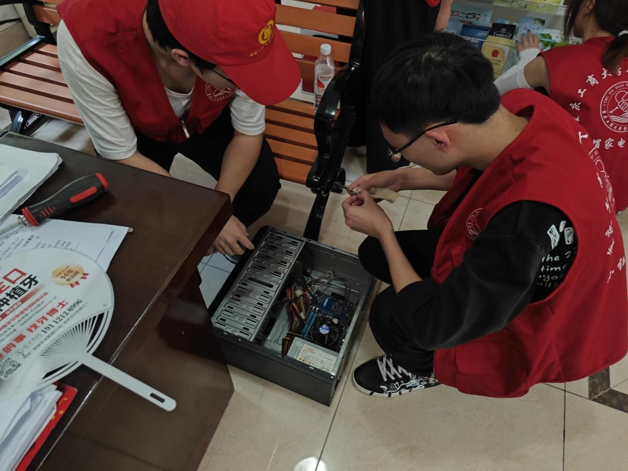 7月17日,团队走进华兴镇惠民社区开展集中义务维修。在当地工作人员的大力支持和广泛宣传下,前来送修的居民络绎不绝。有了前期走访入户经验,团队更了解当地居民怀旧小家电集中的品类和维修痛点,集中义修的配件准备更加充分、故障摸排更加精准高效,大大提高了维修的成功率。此外,实践团还耐心细致的为村民们普及了家电养护小知识,为他们进行简单的维修技术培训,尽力帮助乡亲们打通家电维修最后一公里。