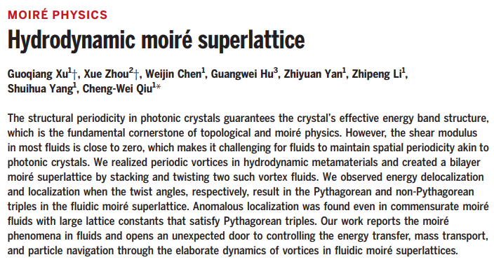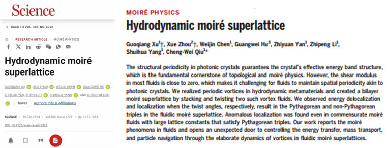 近期,公司伟德国际victor1946应用物理系周雪副教授与新加坡国立大学Qiu Cheng-Wei教授团队合作,在流体输运中构建了首个莫尔超晶格并揭示了其内部的扩散场传输规律。取得的突破性研究成果发表在国际顶级期刊Science(https://www.science.org/doi/10.1126/science.adq2329 )。