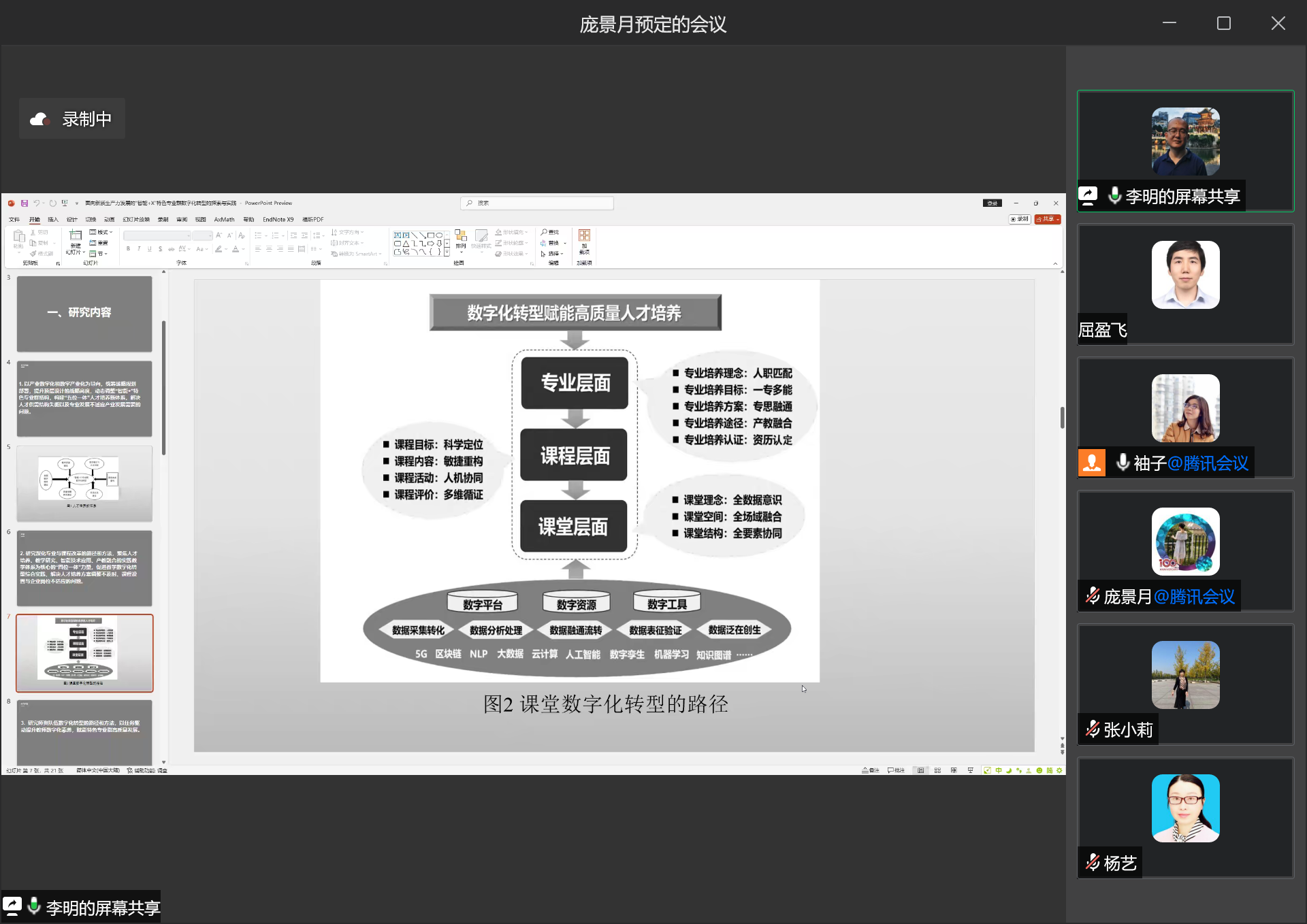 接着,王荣秀老师汇报了《基于“问题导向”的电子信息类专业链条式培养模式探索与实践》课题。她介绍了该课题研究将“学科导向转变为问题导向”,在四年教学过程中贯穿“问题链”,通过改革校内理论与实践教学、校企合作等途径提升教学质量,培养员工解决实际工程问题的能力。李明老师则汇报了《面向新质生产力发展的“智能+X”特色专业群数字化转型的探索与实践》的课题,强调了数字化转型和产业数字化在课程改革中的重要性,提出要以“人才培养”为核心,构建具有时代需求的教学体系。