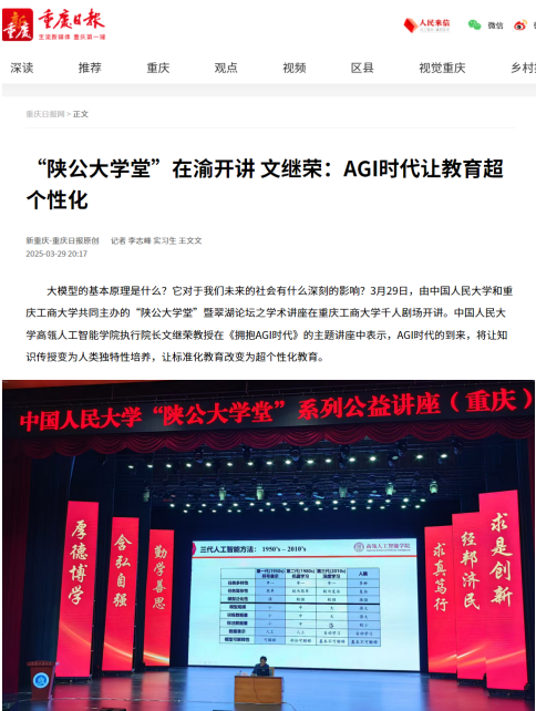 3、 新重庆-重庆日报:《“陕公大学堂”在渝开讲 文继荣:AGI时代让教育超个性化》