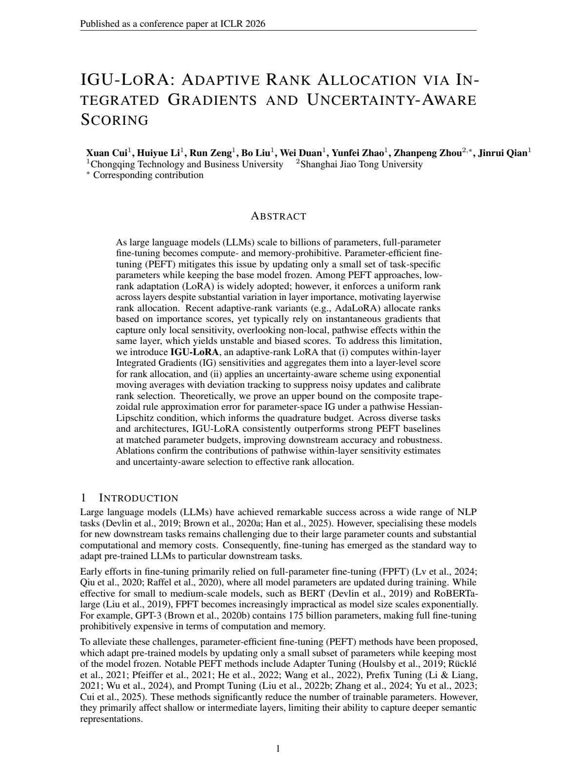 在扎实推进学科专业建设、强化前沿基础研究能力的背景下,公司伟德国际victor1946在大模型微调理论研究方面取得重要突破。近日,由公司大模型理论与应用团队完成的研究论文“IGU-LoRA: Adaptive Rank Allocation via Integrated Gradients and Uncertainty-Aware Scoring”被人工智能与机器学习领域国际顶级会议——国际学习表征大会(ICLR 2026)录用。该成果标志着公司在大模型微调理论领域取得首次原创性突破,彰显出公司在前沿人工智能基础研究方面的国际竞争力。