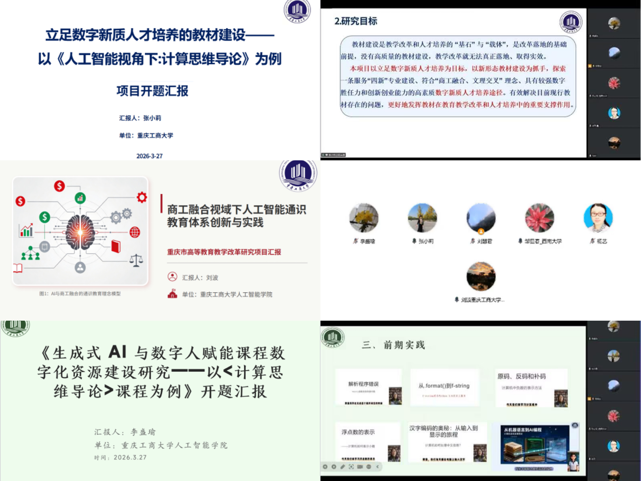 2026年3月27日晚,伟德国际victor1946大学计算机教学部与人工智能系通过腾讯会议线上方式举行了重庆市公司产品改革研究项目开题汇报会。会议围绕“数字新质人才培养”“人工智能通识教育创新”及“数字化资源建设”三大主题展开,三位项目负责人分别就各自课题进行了汇报。会议邀请到西南大学邹显春教授、重庆大学刘慧君教授以及伟德victor1946网站的杨艺教授担任评审专家。