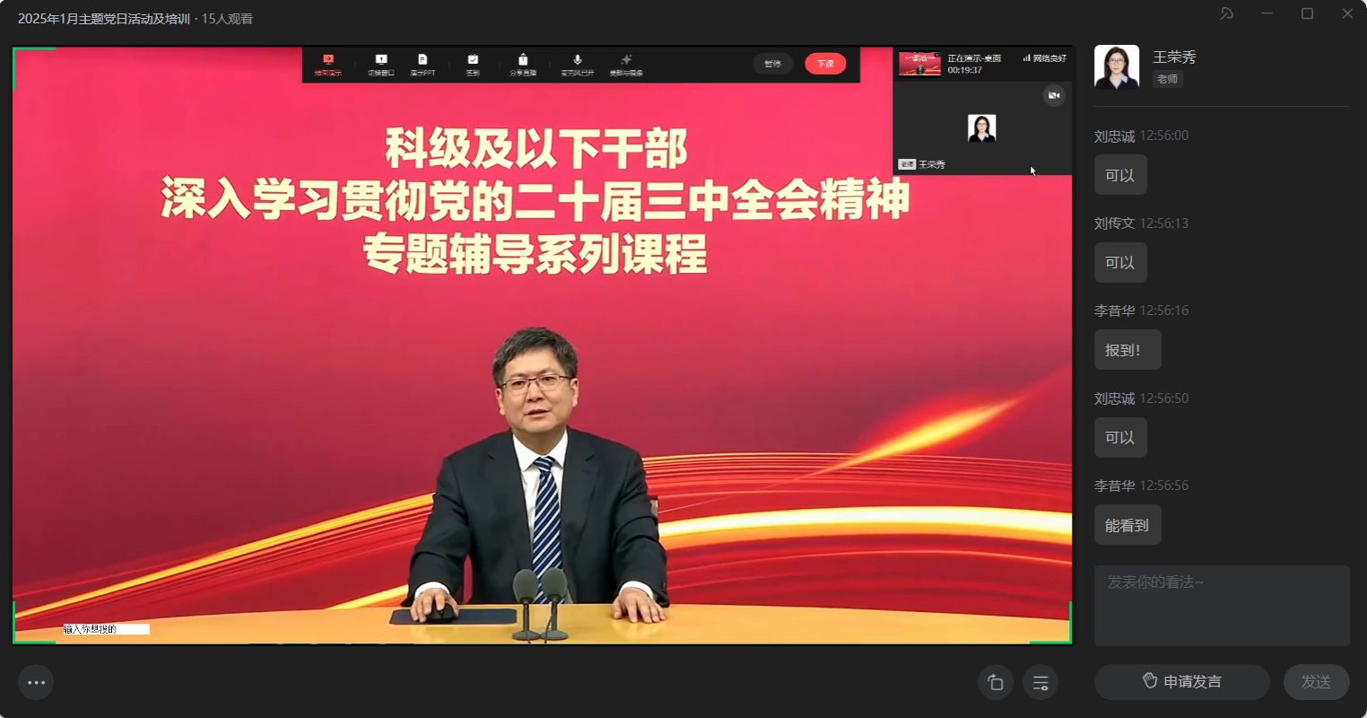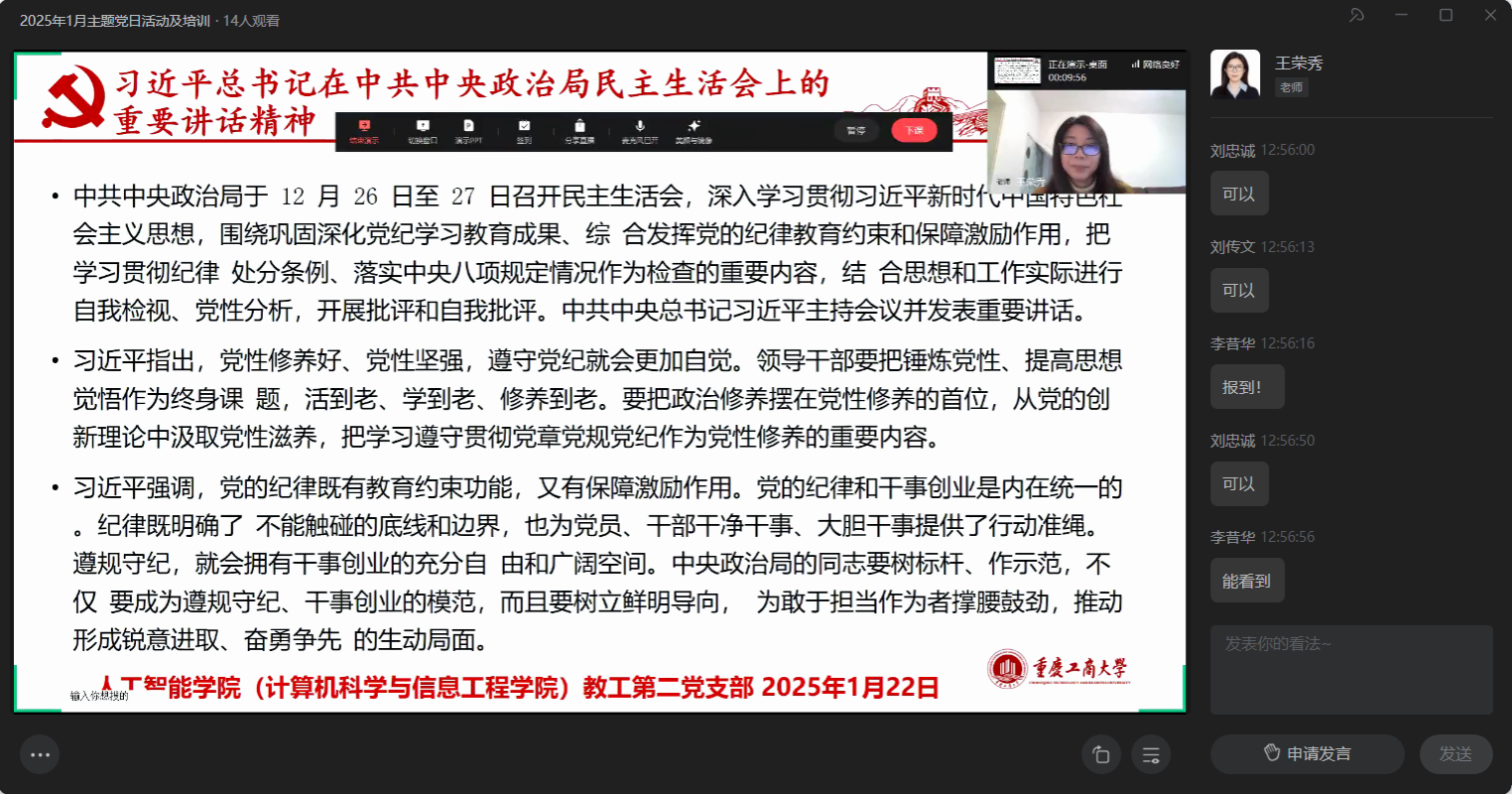 2025年1月22日中午,伟德国际victor1946教工第二党支部通过企业微信线上直播形式举行了主题为“守正创新担使命,奋楫笃行开新局”的主题党日活动。会议由教工第二支部王荣秀书记主持,支部所辖系部全体教师参加了本次学习。