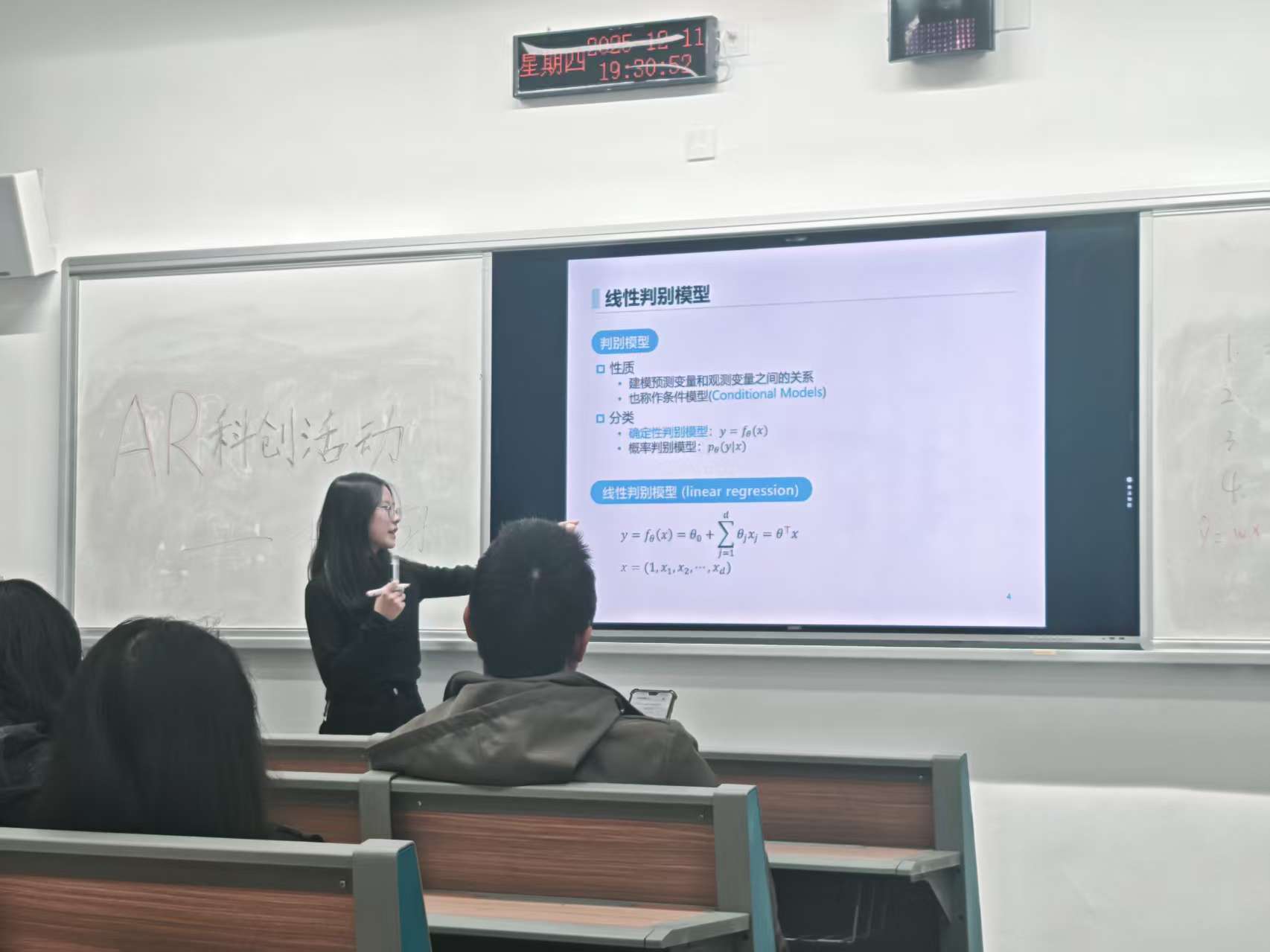 接着,2025级人工智能一班夏顺利同学围绕线性回归模型,阐述了其数学形式、分类与性质,重点讲解了损失函数、梯度下降等关键概念,并结合不同优化方法(如随机梯度下降、批量梯度下降)进行了对比分析,通过实例演示了参数更新与模型训练过程。