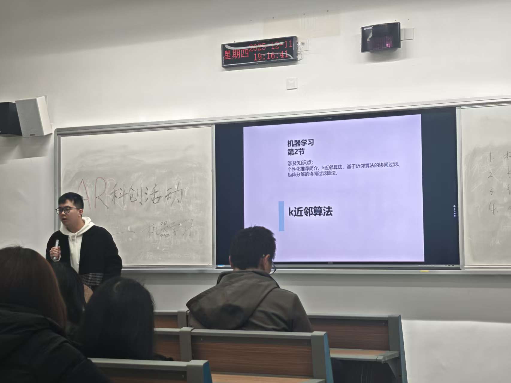 随后,2025级人工智能一班龚高同学结合电商与电影推荐等实际场景,深入介绍了K近邻算法的定义、原理、优缺点,并通过具体案例与代码解读,生动展示了该算法的应用方式。