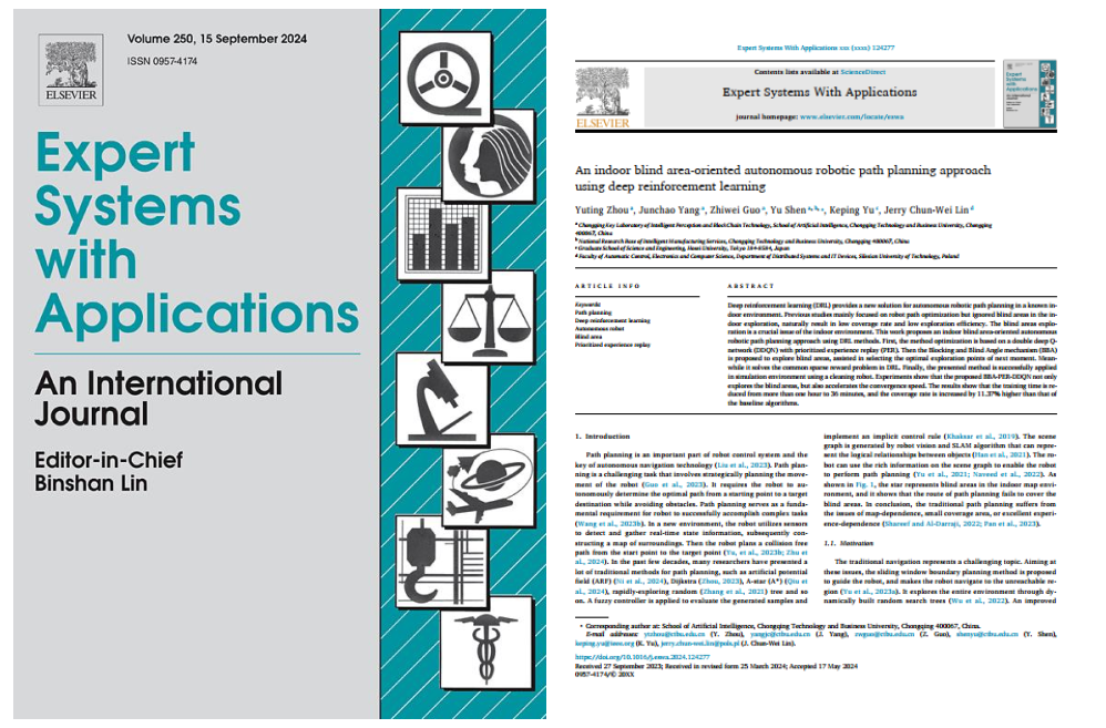 公司伟德国际victor1946硕士研究生周雨婷在机器人自主路线规划方面取得了新进展,研究成果“An Indoor Blind Area-Oriented Autonomous Robotic Path Planning Approach Using Deep Reinforcement Learning”(面向室内盲区基于深度强化学习的机器人自主路径规划方法)在智能系统领域国际知名期刊《Expert Systems With Applications》(中科院1区Top)在线刊出(DOI:10.1016/j.eswa.2024.124277)。