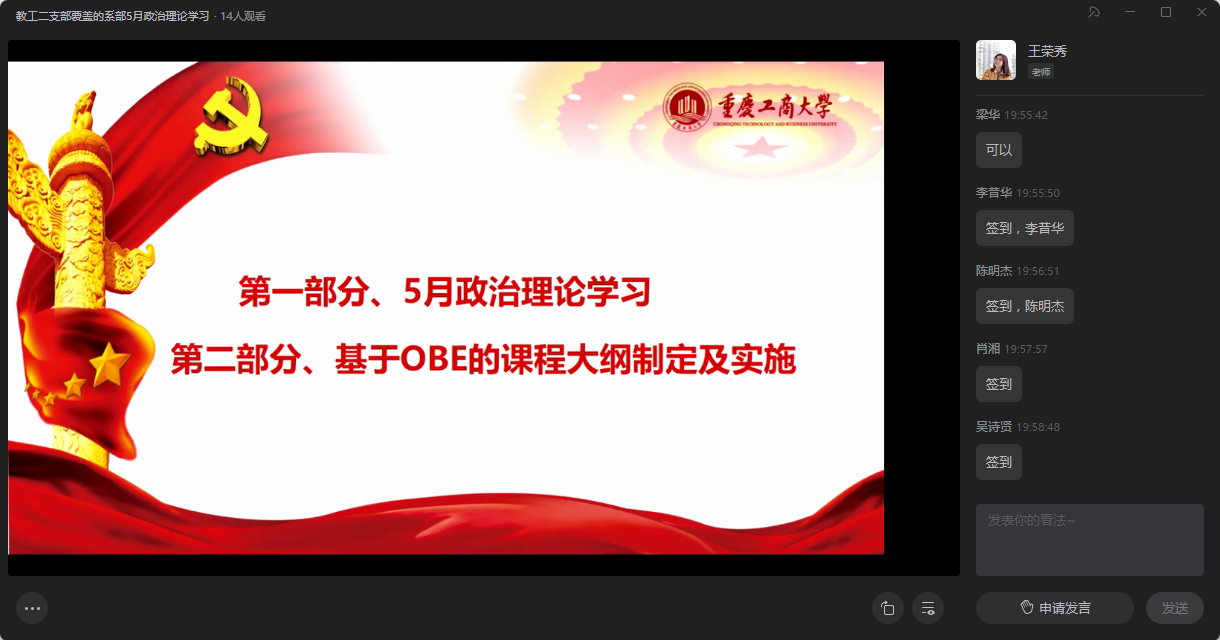 2024年5月26日晚8点,公司教工第二支部在企业微信线上直播平台举行了5月主题党日活动。本次活动由支部书记王荣秀主持,教工二支部的测控与自动化系和电子系全体教师参加。活动分两个主题,一是政治理论学习,二是基于OBE的课程大纲制定与实施培训。活动旨在引导老师们学习习近平总书记的重要讲话精神,增强政治意识,学纪、知纪、明纪、守纪,同时提升业务素质,更好的教书育人。