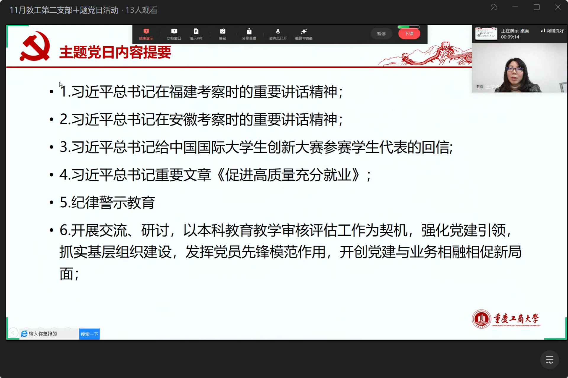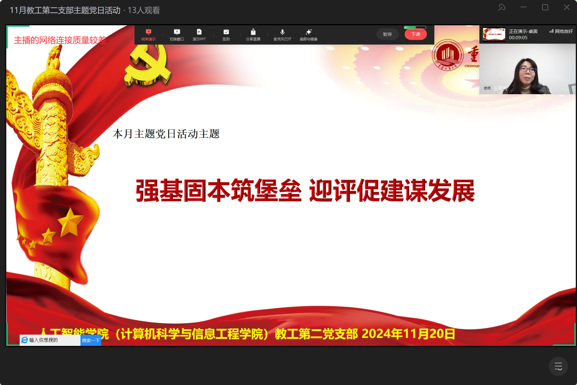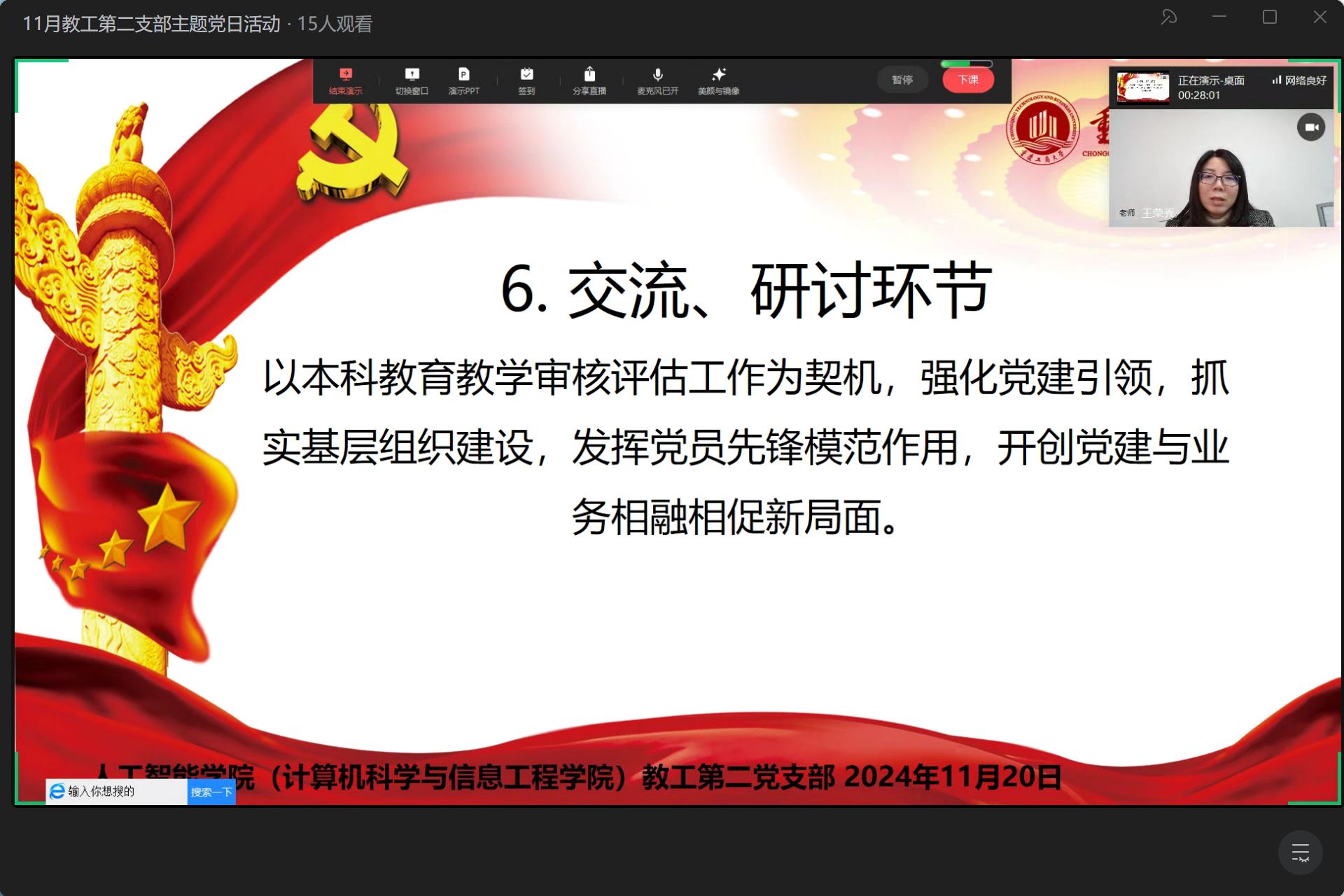 2024年11月25日,教工二支部在王荣秀书记的组织下,通过企业微信线上直播形式举行了本月的主题党日活动。活动围绕习近平总书记的重要讲话精神、党纪教育以及如何在新时代背景下加强党建工作等主题展开,进一步深化了党员们的政治理论水平和党性修养。