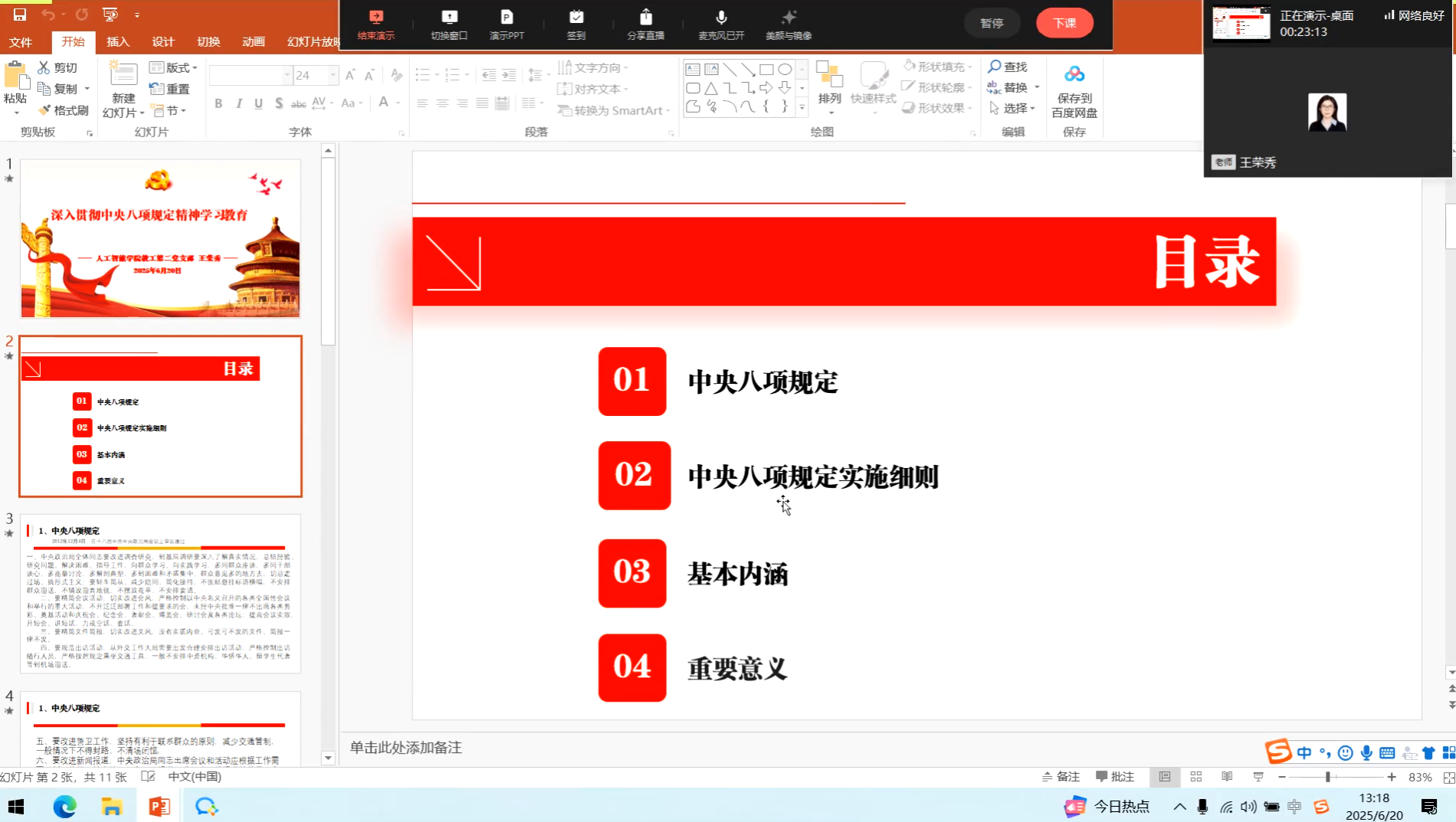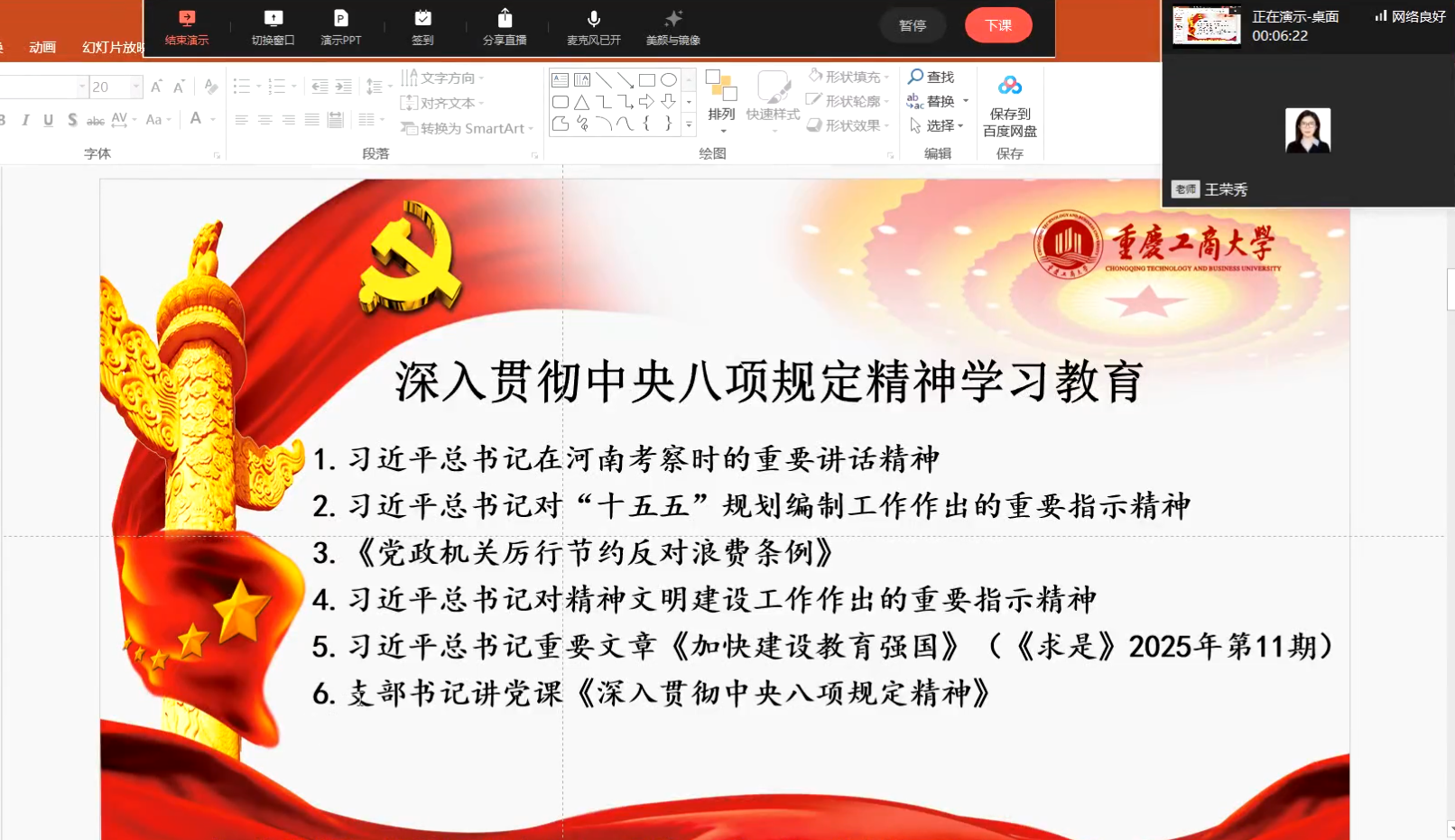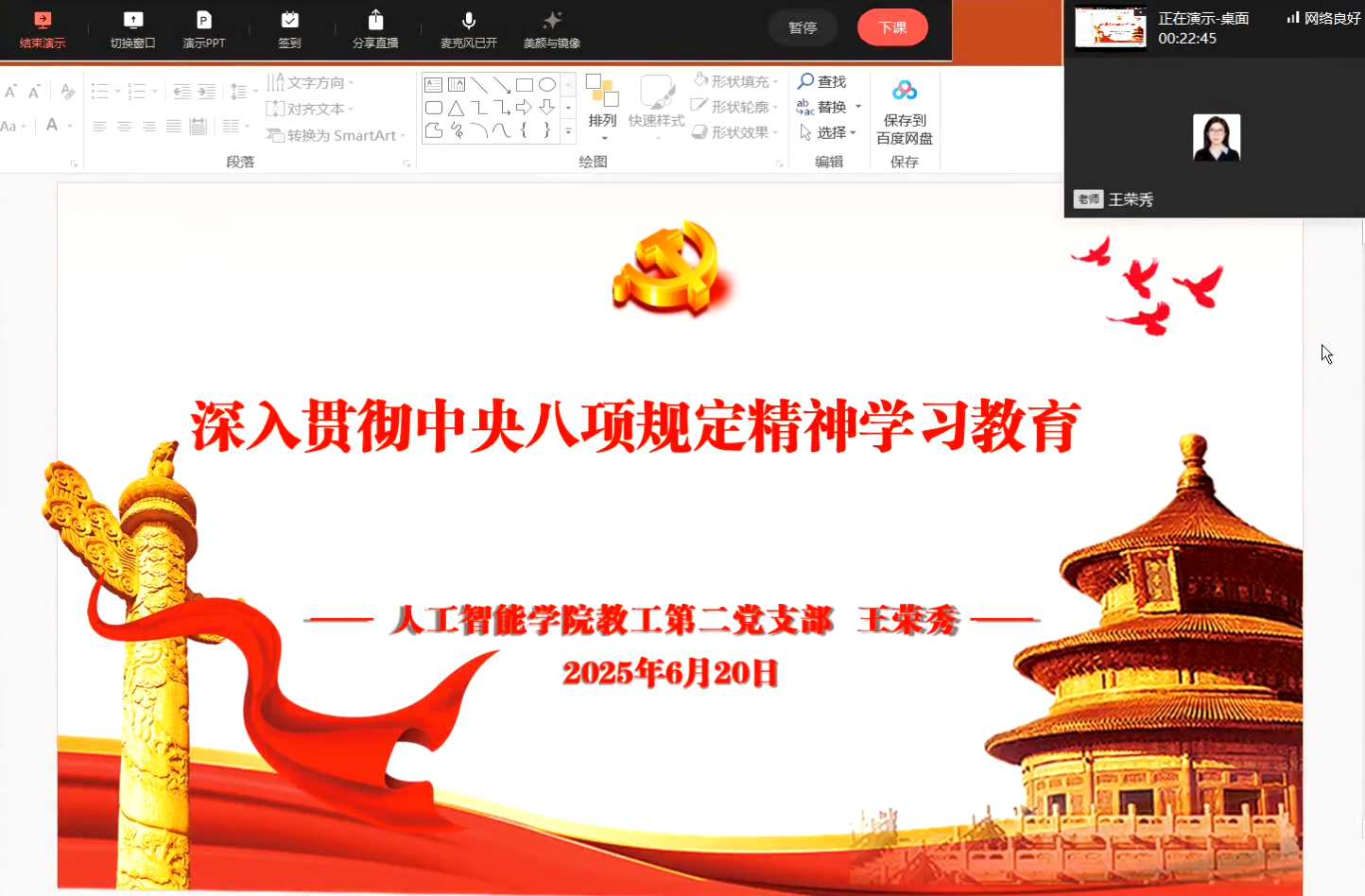 2025年6月20日,教工第二党支部组织了一场政治理论学习活动,活动通过企业微信线上直播的方式进行,由支部书记王荣秀同志主持。此次活动分为两个环节,分别是主题党日活动和支部书记讲党课,内容丰富、形式多样,旨在深入贯彻中央八项规定精神,提升党员的政治理论水平。