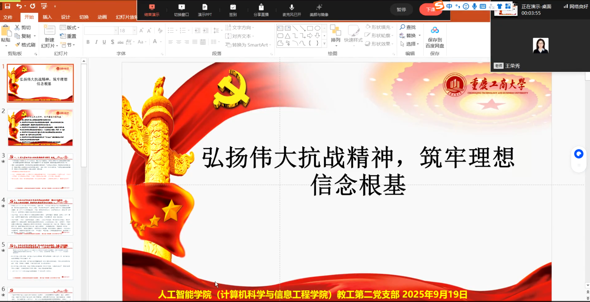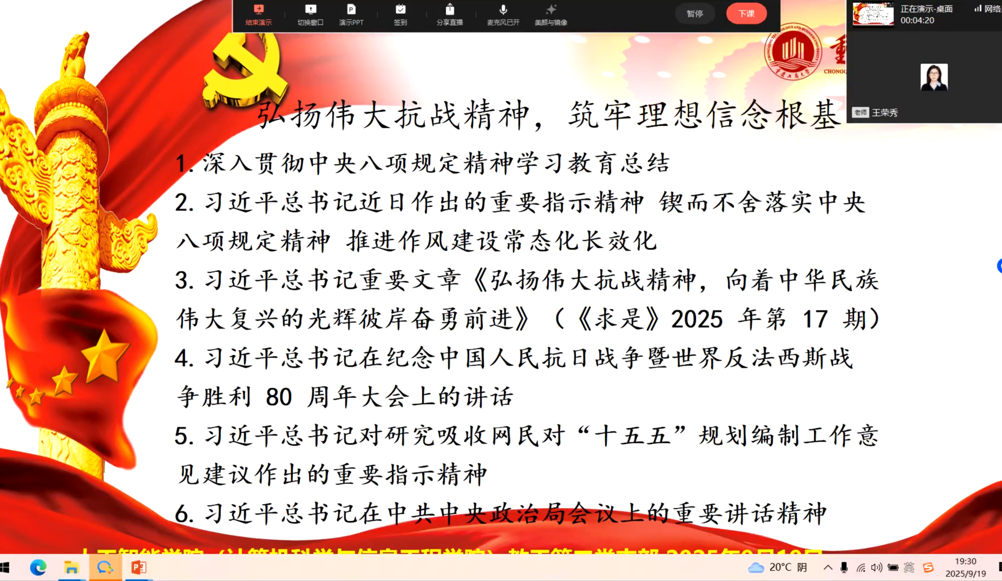 2025年9月19日晚,公司教工第二党支部召开了9月主题党日活动。本次活动由王荣秀书记组织,采用企业微信线上直播方式进行,教工第二党支部全体党员参加了会议。会议主要围绕习近平总书记的重要讲话精神和系列指示展开,本次活动以“弘扬伟大抗战精神、筑牢理想信念根基”为主题,深刻解读了党风廉政建设相关政策。
