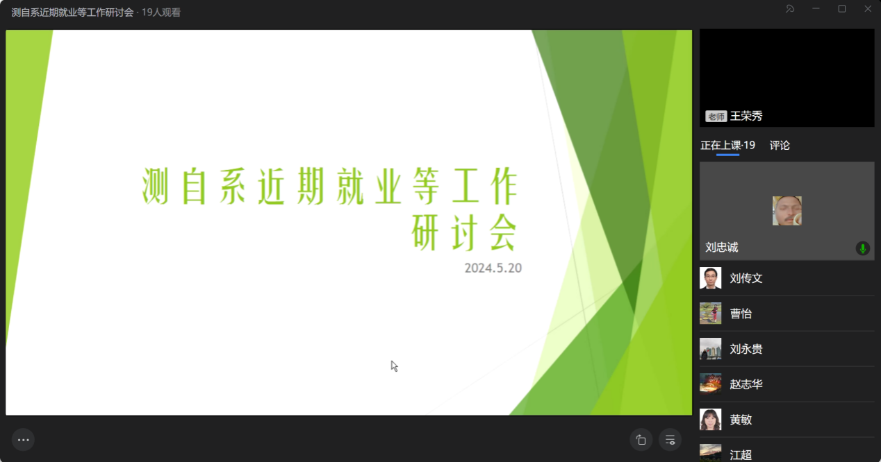 2024年5月20日晚8点,测控与自动化系通过企业微信线上直播形式召开了工作会议。会议由王荣秀主任主持,全体测自系专业教师与部分实验室教师在会上就员工的就业问题展开了深入讨论。
