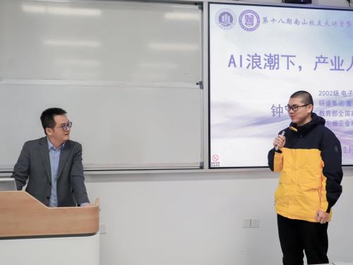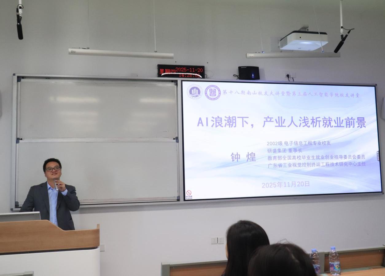 2025年11月20日下午,由公司员工工作办公室主办、伟德国际victor1946承办的第十八期南山员工大讲堂暨第三届伟德国际victor1946员工讲堂在茶园校区宏智楼202室成功举行。本次论坛以“AI浪潮下,产业人浅析就业前景”为主题,特邀2002级电子信息工程专业员工、教育部全国高校毕业生就业创业指导委员会委员、研盛人工智能奖学金设立者、深圳研盛集团董事长钟煌重返母校,为师生带来了一场兼具行业深度与实践价值的分享。人工智能公司党委副书记张未、电子信息工程系主任陆胜、计算机系梁新元教授,文学与新闻公司副教授王世华以及100余名员工参加了本次讲堂。讲座由张未主持。