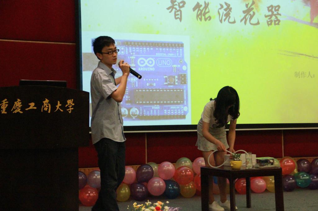 本次大赛历时一个半月,在初赛的激烈角逐中,十组选手脱颖而出,带着他们的小发明来到了现场。决赛精彩纷呈,各种大神作品让观众惊叹。既有护花使者“智能浇花器”,又有实用“微型控温箱”,还有“善解人意”的“手势遥控车”,更有照明、音响、蓝牙、充电宝集于一身的“多功能魔盒”,还有提供app协助的“飞鱼垂钓智能辅助系统”,绚丽惊艳的“逆变器”,体贴入微的, “为装逼而生” 的“3D显示器”,高效快捷的“钞票分类识别整理机”,环保实用的“鞋底拖”。,最终,第七组“V5团队”以体贴入微的作品和超高的人气同时荣获“一等奖”与“最佳人气奖”,而第一、三组选手获得了“二等奖”,第五、六、十组选手获得了“三等奖”,第二、四、八、九组选手则获得了“优胜奖”。计信公司党总支副书记陈亚惠、胡卫军副教授、计信公司李明副教授、计信公司梁华老师分别为获奖选手颁奖。最后,计信公司胡卫军副教授为我们选手的技术进行了点评,使在场同学大大受益。