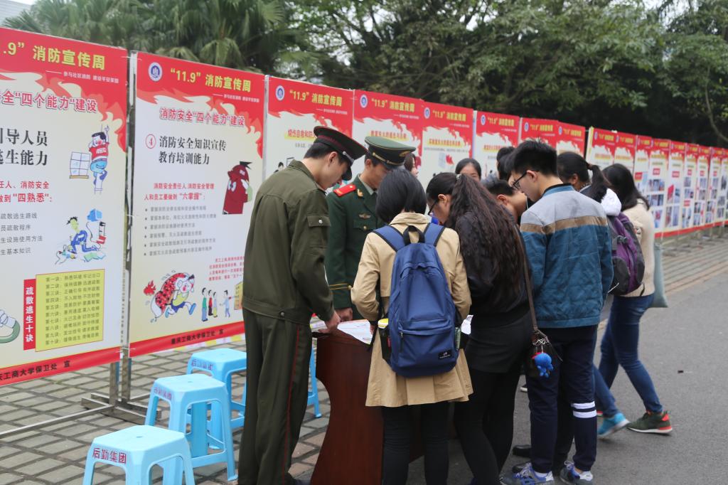 119号上午,公司保卫处、南岸区消防支队二塘中队消防员与计信公司员工会的同学一起在公司7教门口摆放公司教室、宿舍、计算机室、实验室等场所的消防知识宣传板报、并且在现场设置咨询答疑台,发放火灾事故预防、火灾事故逃生急救知识等宣传单,为工商师生宣讲消防知识。老师和同学们都主动上前观看展板内容,拿取消防宣传资料来提升自我消防安全意识。