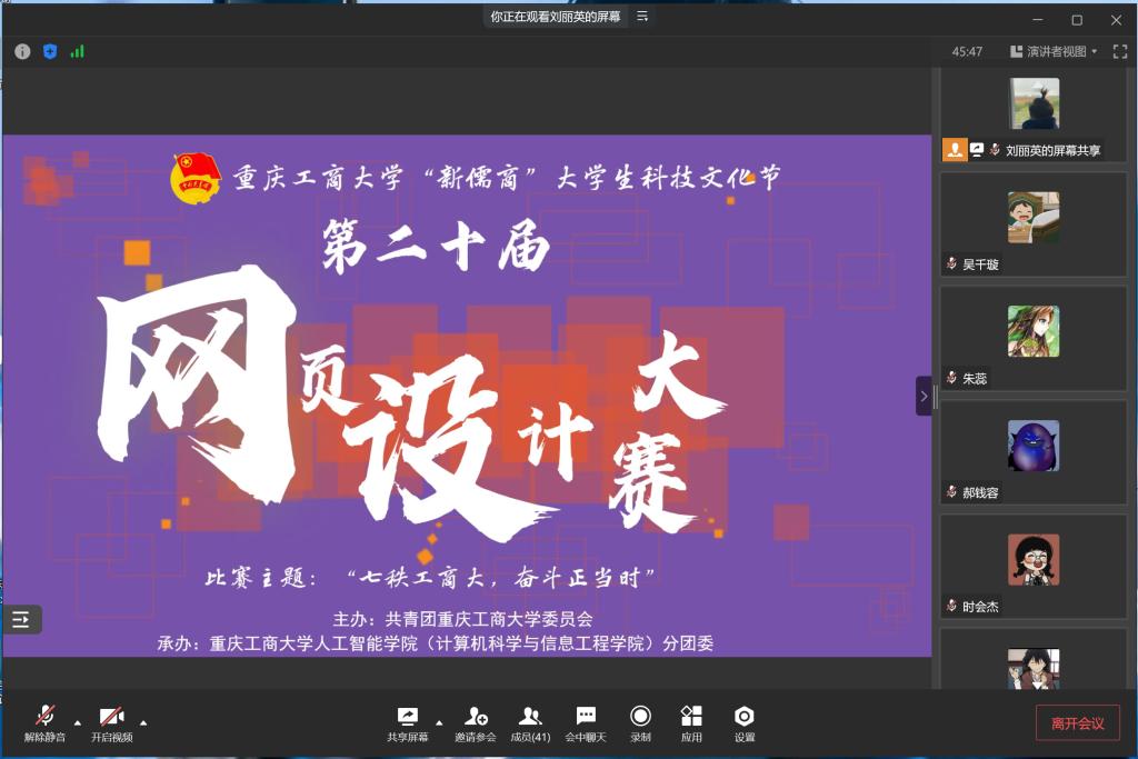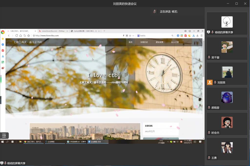 为充分展示“含弘自强 经邦济民”的重工商大精神以及70年接续奋斗的历史风貌,为员工提供学习交流、技术合作的平台,伟德国际victor1946第二十届网页设计大赛于5月15日上午十点在企业微信以线上会议方式举行。伟德国际victor1946杨艺教授、2019级员工张云驰担任评委。本次网页设计以“七秩工商大,奋斗正当时”为主题,围绕公司发展历史、建设成果、员工资源等方面进行网页图像、相关素材及功能进行设计实现。
