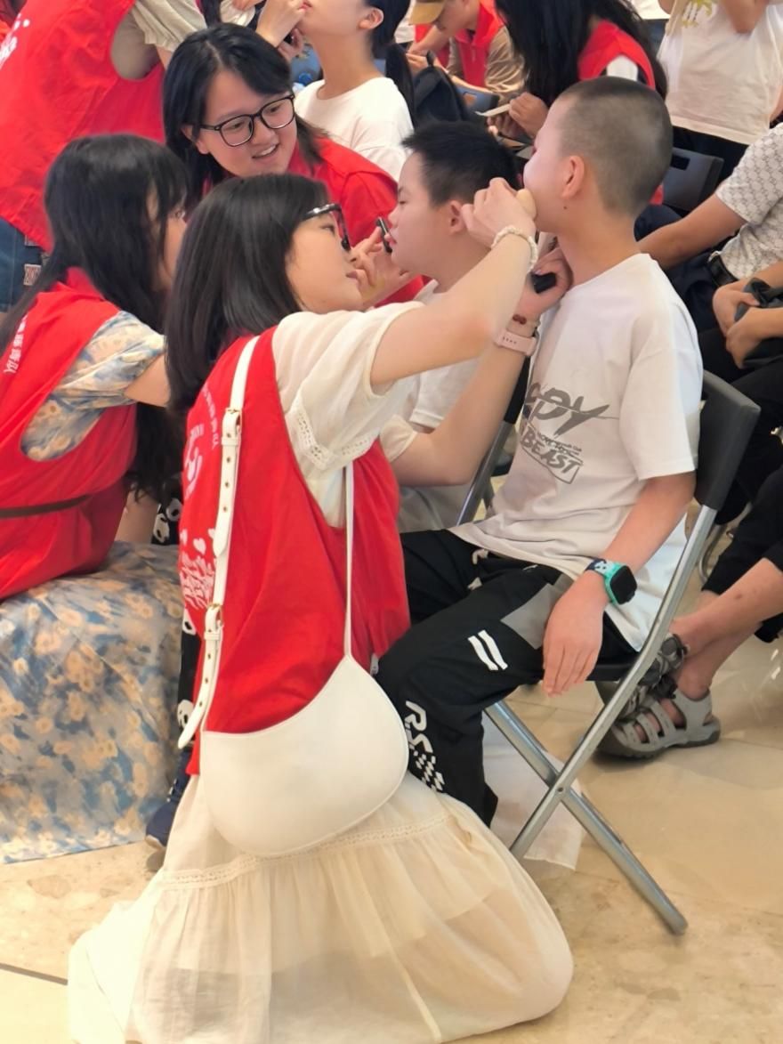 图为志愿者为小朋友化妆