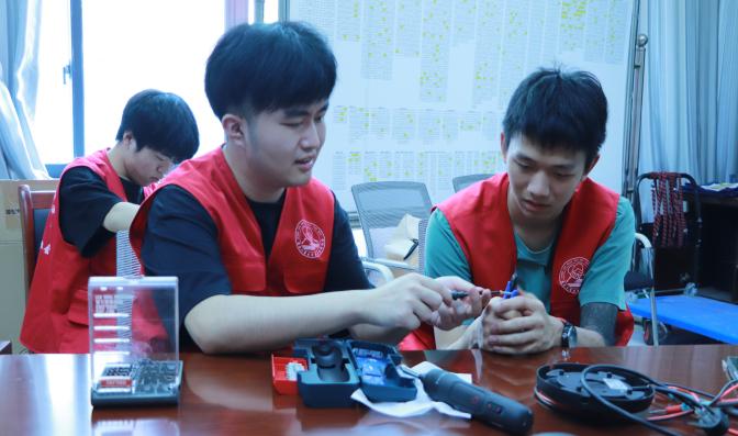 7月7日下午至9日上午,实践团在万新社区党建服务中心设立义务维修点。居民们纷纷送来电风扇、电饭煲、电热水壶、电磁炉、收音机等故障电器。队员们运用电子电路知识和智能检测技能,耐心排查故障,精准维修,现场成功修复电器26件。维修点前,人流不断,“这些老员工技术过硬,我的三十年老古董电风扇又可以转了!”社区居民王阿姨拿着修好的电器赞不绝口。