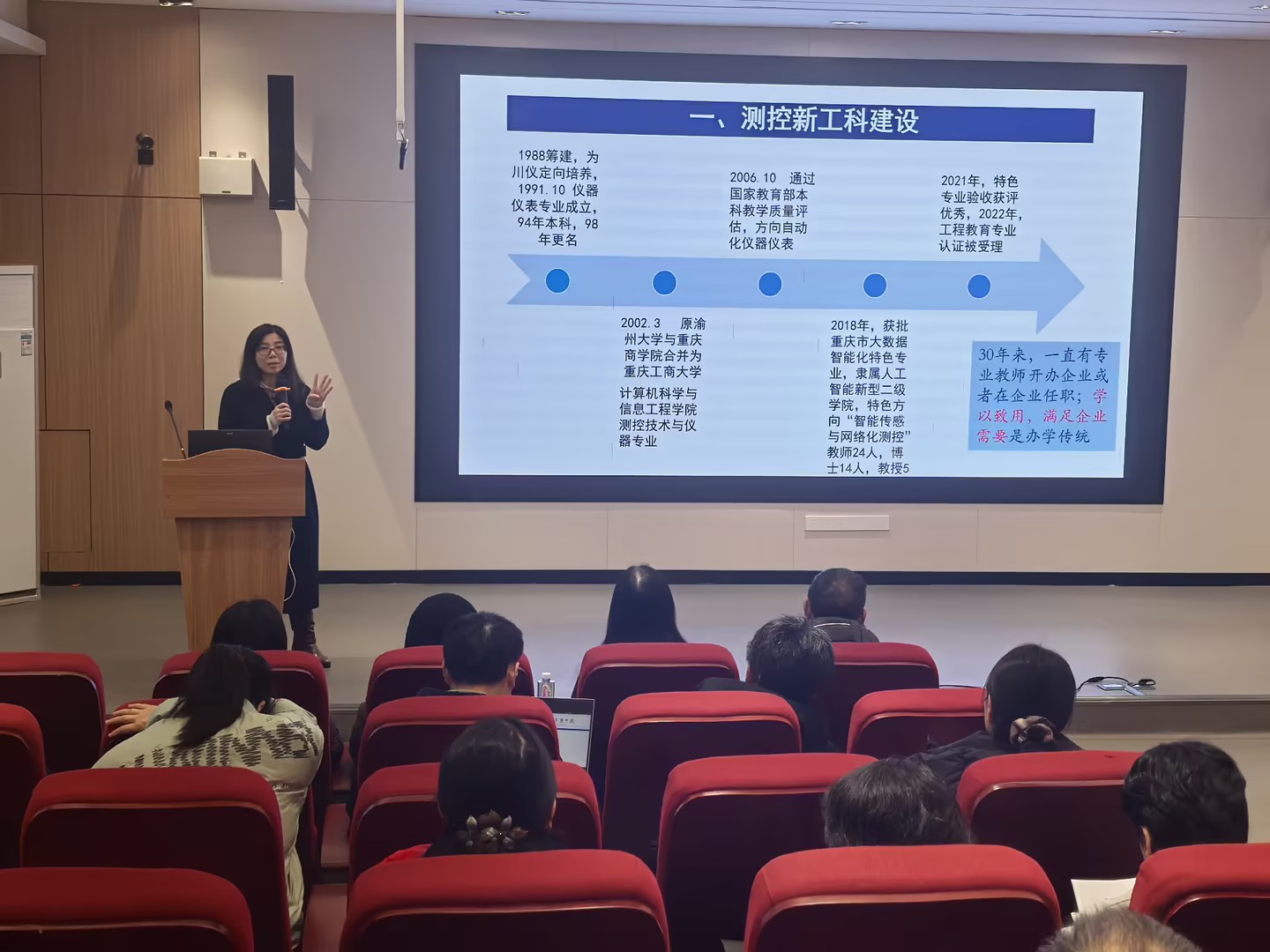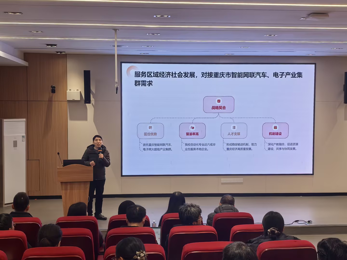 测控与自动化系副主任屈盈飞阐述了自动化专业如何依托教师工程背景,深化产教融合,精准锚定特种与非标自动化发展路径,以对接重庆市智能网联汽车、电子产业集群的精准人才需求。