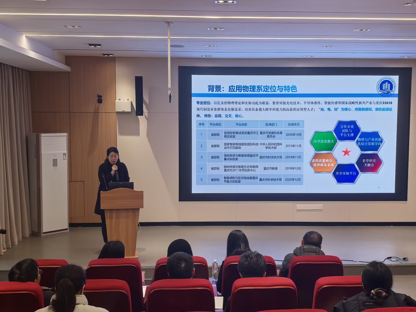 应用物理系主任张翠玲阐释了“价值塑造-知识构建-能力达成”三维一体的人才培养目标,以及“教学创新+科研反哺”双引擎驱动的专业建设架构。